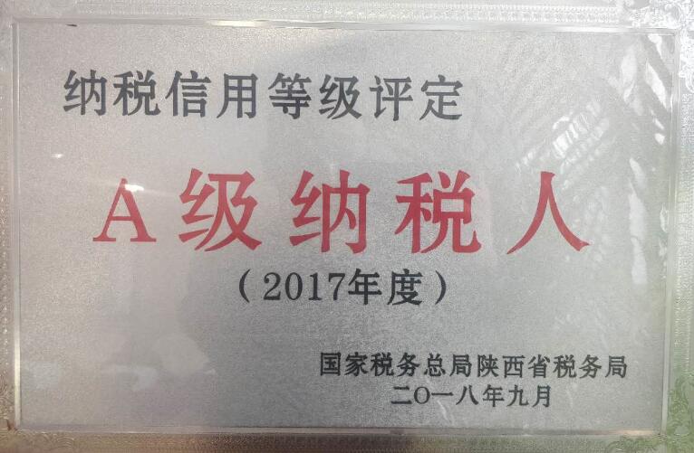 熱烈祝賀我公司榮獲國家稅務(wù)總局陜西省稅務(wù)局評定的“2017年度納稅信用等級評定A級納稅人”。“納稅信用等級A級納稅人”是國家稅務(wù)總局陜西省稅務(wù)局授予信用良好企業(yè)的最高級別榮譽(yù)稱號。