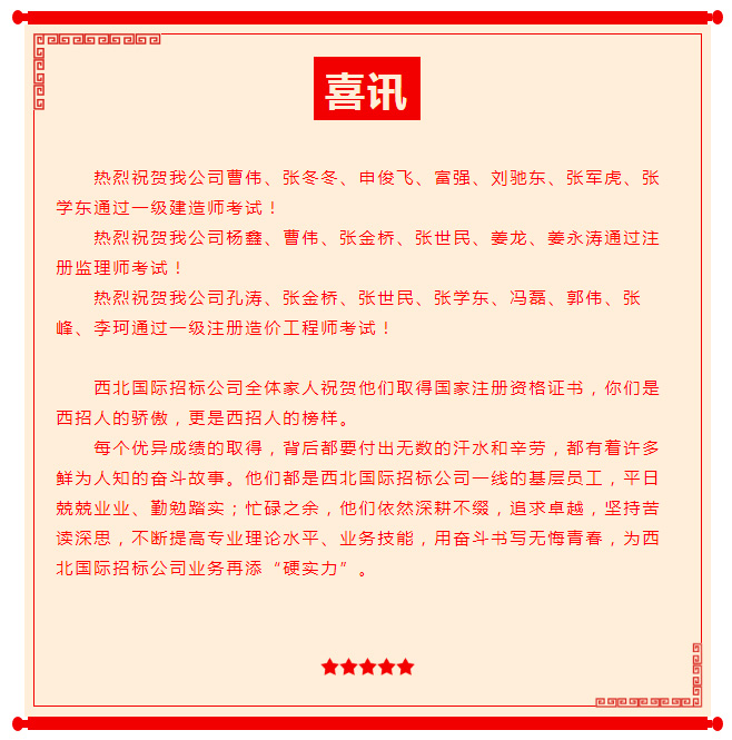 實(shí)力上榜——恭喜西北國(guó)際招標(biāo)公司17人獲得國(guó)家注冊(cè)執(zhí)業(yè)資格