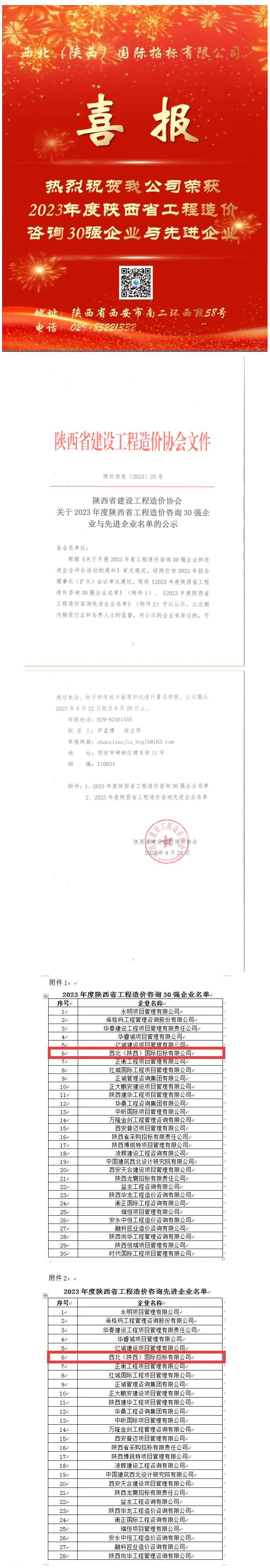 熱烈祝賀我公司榮獲2023年度陜西省工程造價咨詢30強企業(yè)與先進企業(yè)