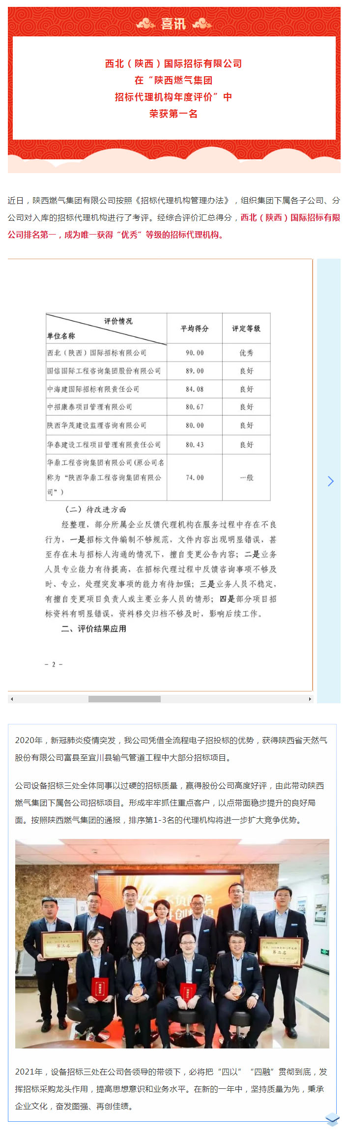 我公司在“陜西燃氣集團 招標代理機構(gòu)年度評價”中 榮獲第一名