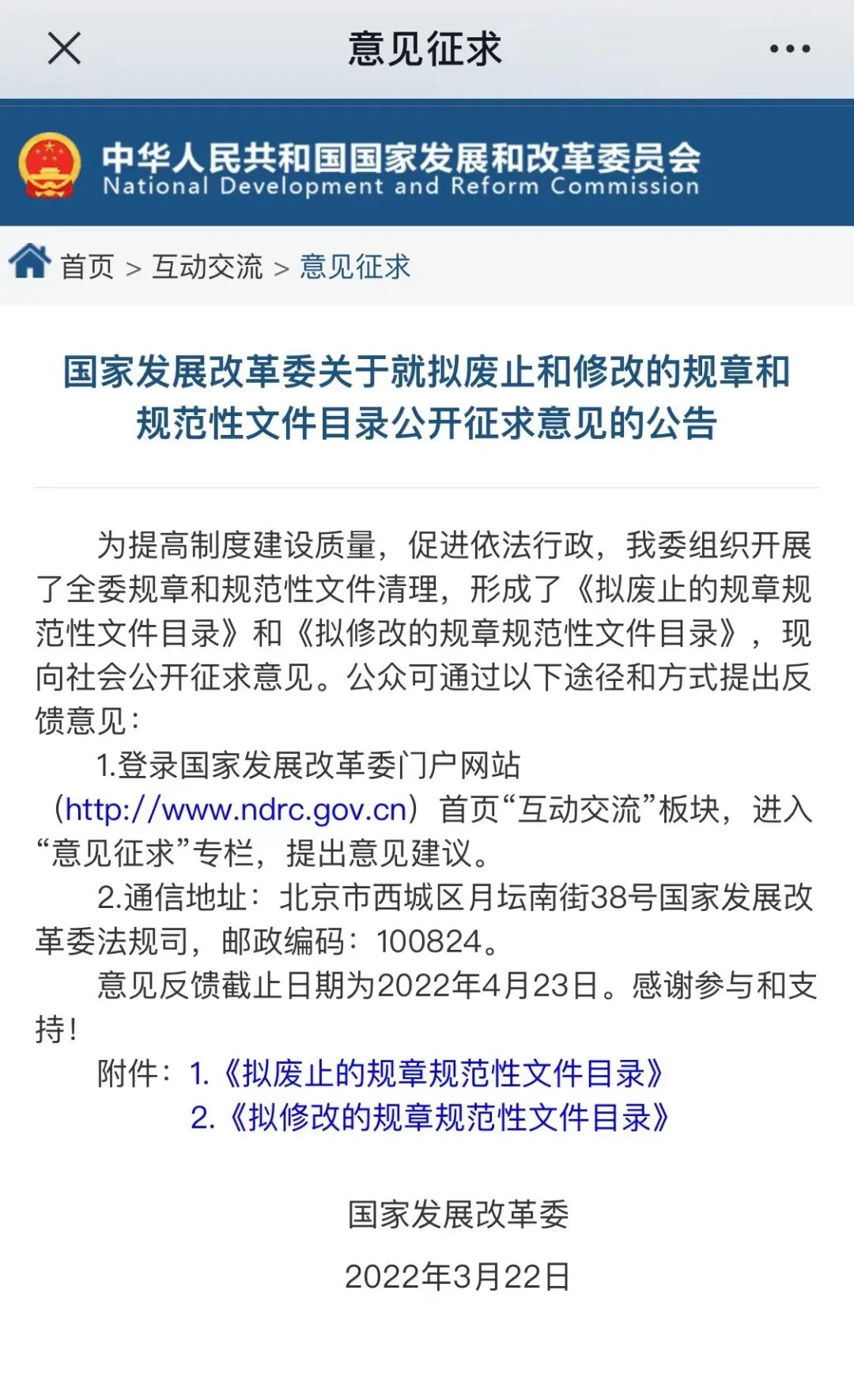 公眾可登錄國(guó)家發(fā)展改革委門戶網(wǎng)站(http://www.ndrc.gov.cn)首頁(yè)“互動(dòng)交流”板塊,進(jìn)入“意見征求”專欄等方式,提出意見建議。意見反饋截止日期為2022年4月23日。