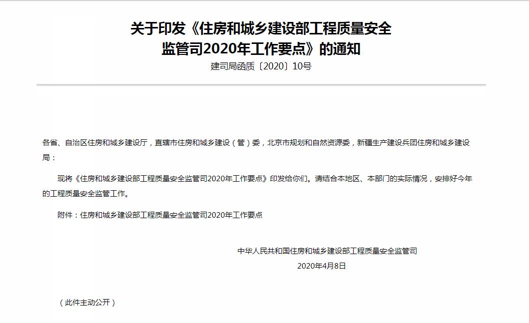 剛剛,住建部印發(fā)《住房和城鄉(xiāng)建設(shè)部工程質(zhì)量安全監(jiān)管司2020年工作要點(diǎn)》的通知,明確指出: